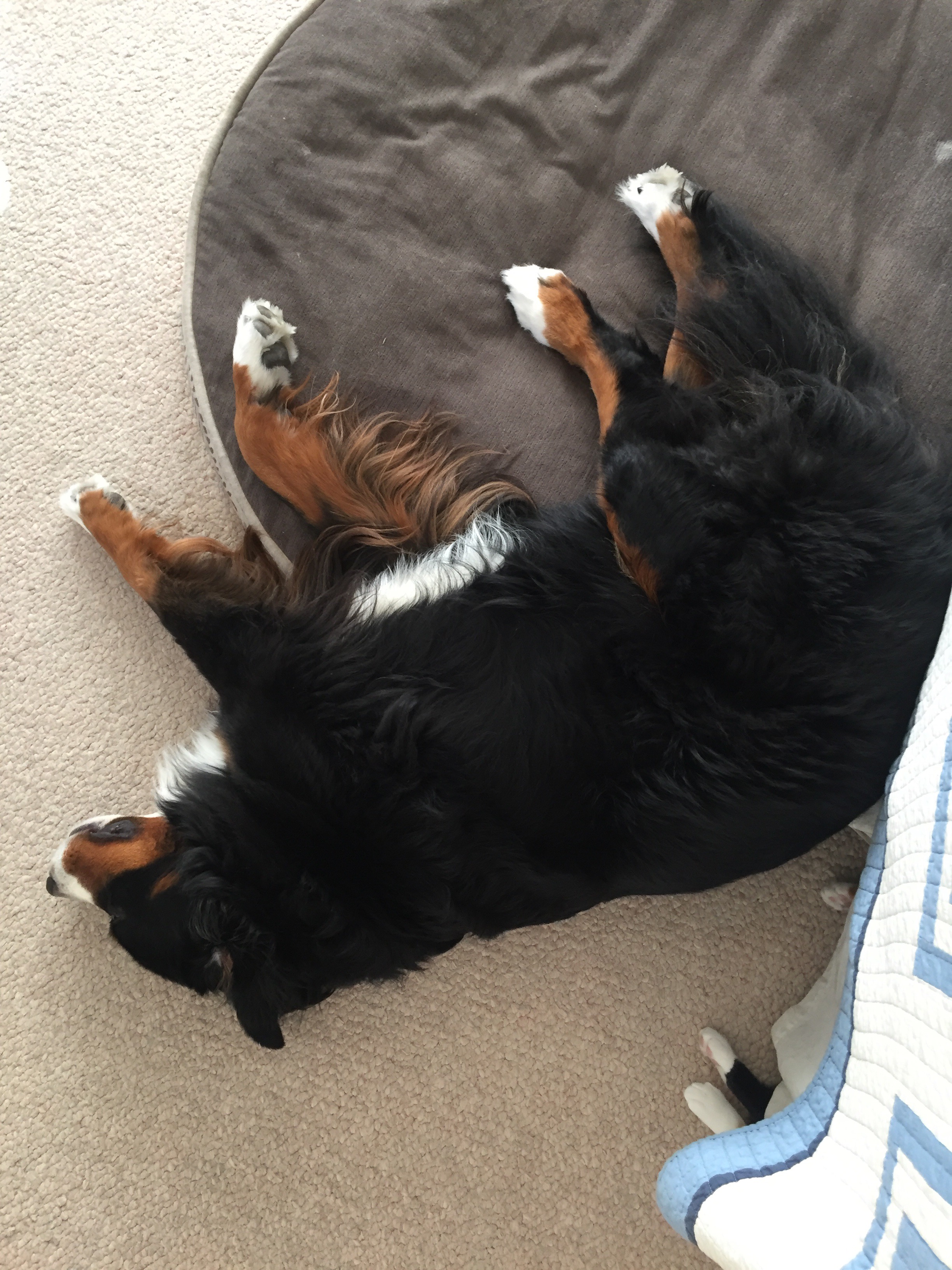 Anyway, we were a couple of houses from our own house and I noticed a man walking a dog. I noticed mainly because the dog looked like my dog, a Bernese Mountain dog. I said to my daughter, “Hey, that looks like my dog!” and she said after a pause, “Um, Mom. That’s Dad!” (Frankly, she sounded kind of judgmental, as if she’s never mistaken her loved one for a total stranger. Whatevs, man. Fourteen year olds think they know it all.)