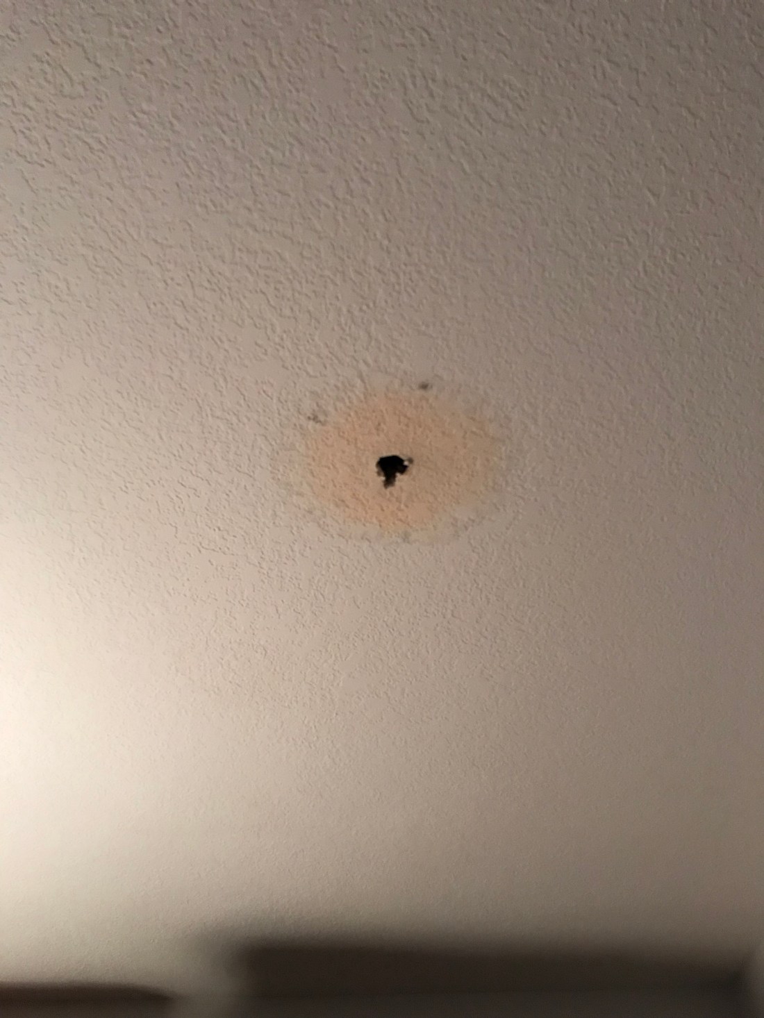 This is the ceiling that was repaired after a toilet overflowed and left puddles of water that rained onto my desk. It cost a lot and involved my insurance company and ended up raising my insurance rates.